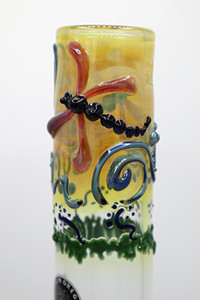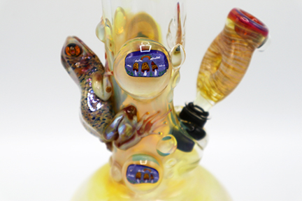 It was during JBD’s heyday in the early 2000s that they produced the bong we have in our museum collection. The base of the tube features a spotted frog and several small bubbles (inside of which are tiny mushroom scenes), and at the top of the tube is a colorful swirly design that includes two dragonflies—all common adornments of their work at the time. Harris had to reacquire it from a private collector in order to provide it to the museum. The piece, which Harris refers to as “a really pure example of the JDB style in Eugene at its height,” was originally sold for around $500, but is now valued at around $8000. This exponential increase in value is true for most of the pieces from this period, which Harris describes as “pre-Op.” What does pre-op mean, you may ask? Keep reading.